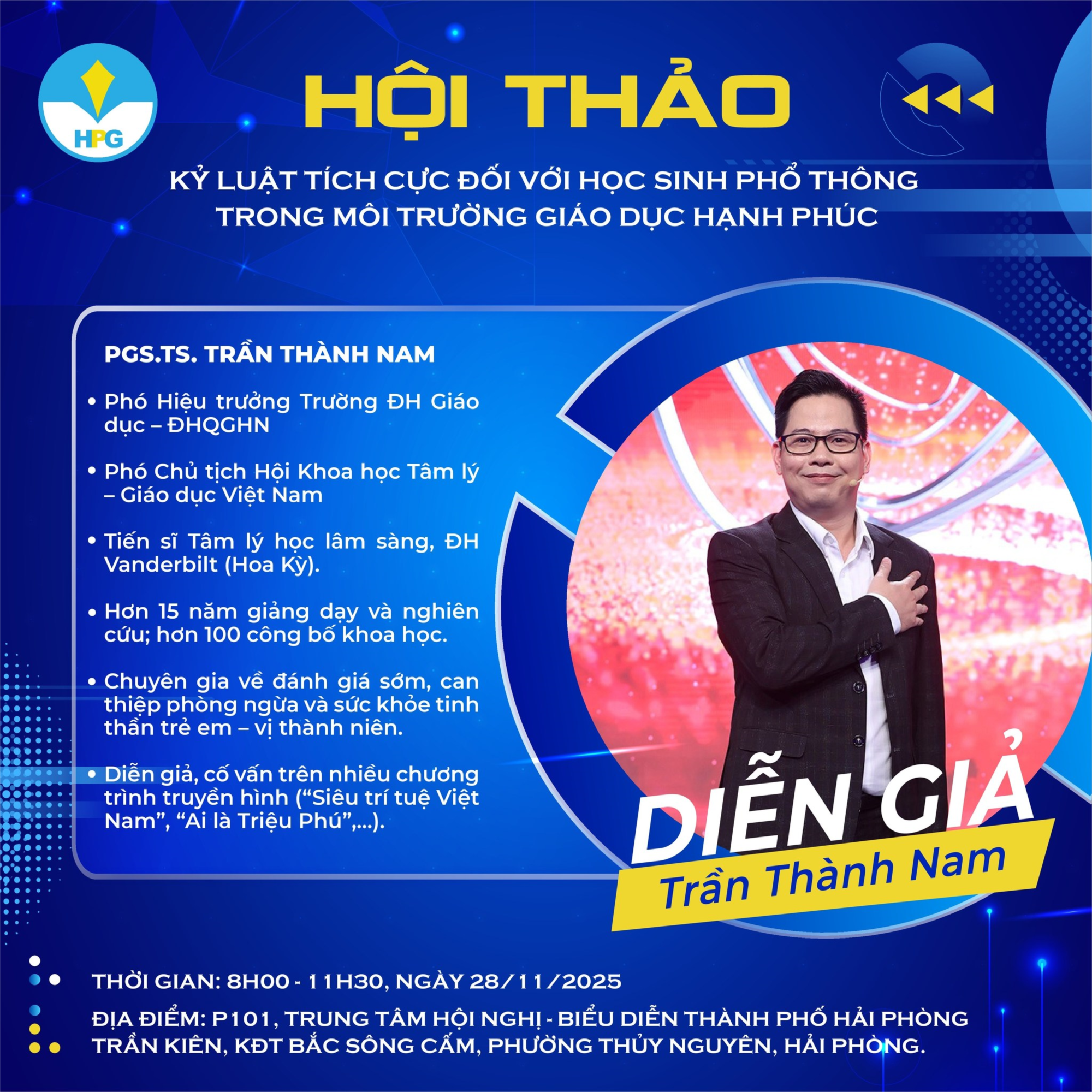 Hội thảo "Kỷ luật tích cực đối với học sinh phổ thông trong môi trường giáo dục hạnh phúc" vô cùng vinh dự được cố vấn và chia sẻ bởi PGS.TS Trần Thành Nam.