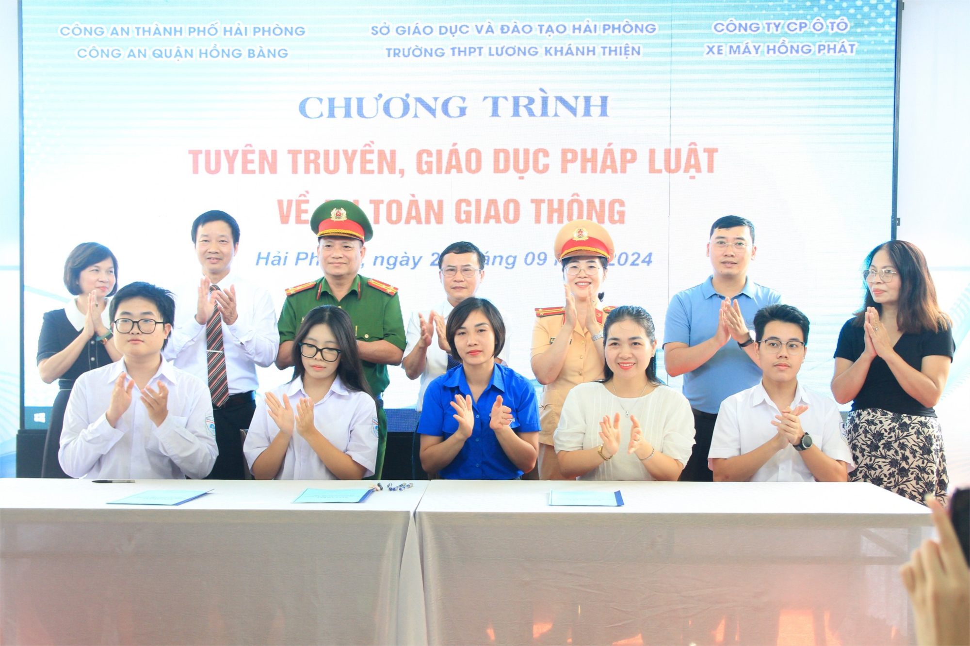 Nhân dịp này, nhà trường phối hợp với Công an quận Hồng Bàng tổ chức ký cam kết thực hiện đúng các quy định về bảo đảm TTATGT, nhiều phần quà ý nghĩa như những cuốn sách tuyên truyền về ATGT, mũ bảo hiểm được Công an quận Hồng Bàng và Công ty CP ô tô xe máy Hồng Phát trao tặng tới thầy và trò nhà trường. ️