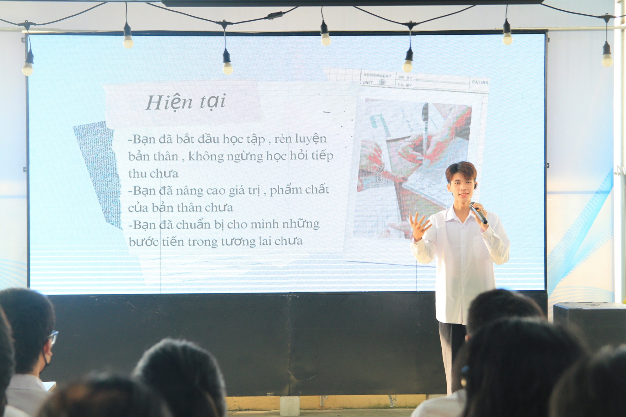 Trong buổi tọa đàm, các em học sinh của lớp 11A5 đã có buổi thuyết trình đầy tự tin, thuyết phục cũng như màn trao đổi, chia sẻ, hỏi đáp sôi nổi với các thầy cô nhà trường cùng học sinh đại diện cho khối lớp 10 và 12. Nội dung của buổi tọa đàm tập trung vào vấn đề nhận diện, phát triển bản thân của mình tại hiện tại, bày tỏ những khát vọng, ước mơ đẹp đẽ về tương lai. Trong đó, vấn đề trọng tâm là xác định việc không ngừng học tập, trau dồi, rèn luyện bản thân là yếu tố then chốt để có được cuộc sống đầy ý nghĩa và tương lai tươi sáng, rộng mở.
